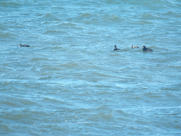 Den 3. fugl fra højre er en han. Ellers hanner af sortænder. Lagt på 1. december 2025, taget 1. december 2025 på Flyvesandet på Fyns Kattegatkyst.