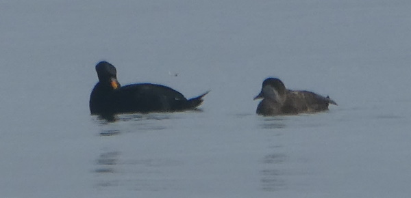 Til venstre for to hanner af sortand. Lagt på 29. januar 2019, taget 29. januar 2019 på Enebærodde i Odense Fjords udmunding i Kattegat.