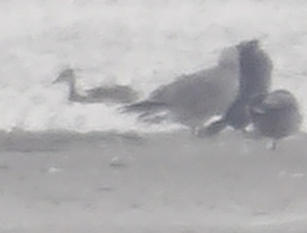 Den fra før forstørret. Mellem sølvmåge og gråand. Til venstre en hunlig atlingand. Lagt på 14. marts 2026, taget 14. marts 2026 på Agernæs Flak ved Flyvesandet på Fyns Kattegatkyst.