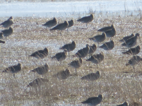 Lille regnspove bag en anden lille regnspove midt i billedet. Ellers store regnspover. Lagt på 3. april 2022, taget 3. april 2022 ved Ølundsgårds Inddæmning ved Odense Fjord.