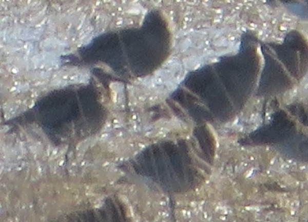 De 2 lille regnspover fra før forstørret. Over, under og til højre for dem store regnspover. Lagt på 3. april 2022, taget 3. april 2022 ved Ølundsgårds Inddæmning ved Odense Fjord.