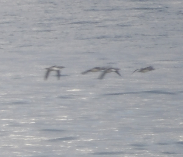 Islom flyver ude til venstre under en sule. Til højre flyver 3 rødstrubede lommer. Lagt på 24. maj 2018, taget 24. maj 2018 på Grenen.