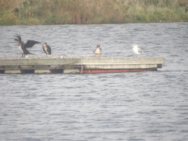 Fra venstre 2 skarver, stor skallesluger hun og sølvmåge. Lagt på 11. oktober 2025, taget 11. oktober 2025 på Sybergland ved Kerteminde på Nordøstfyn.