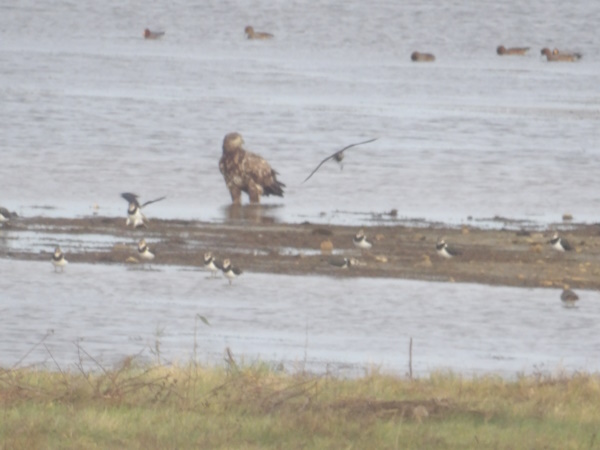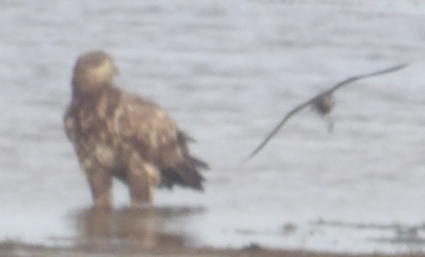 Den fra før og havørnen forstørret. Lagt på 5. november 2025, taget 5. november 2025 fra Egensehytten ved Engsøen på Gyldensteen Strand 4 kilometer øst for Bogense på Fyns Kattegatkyst.