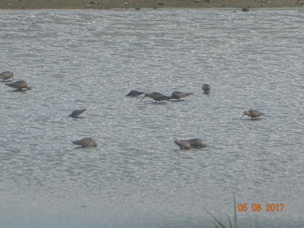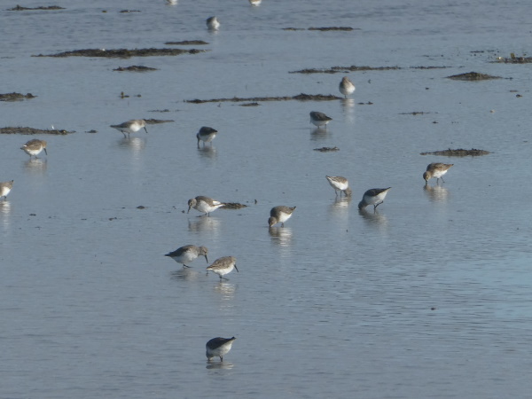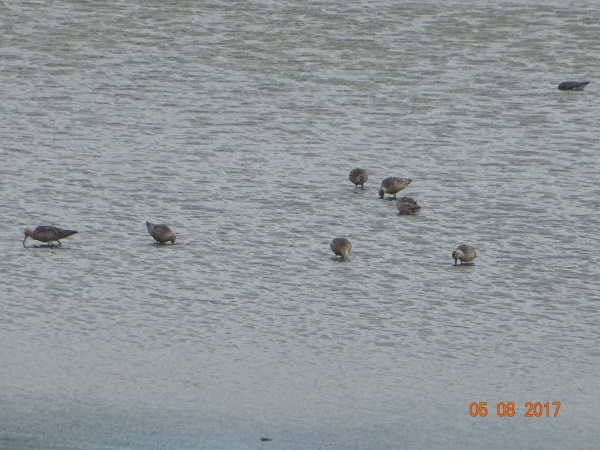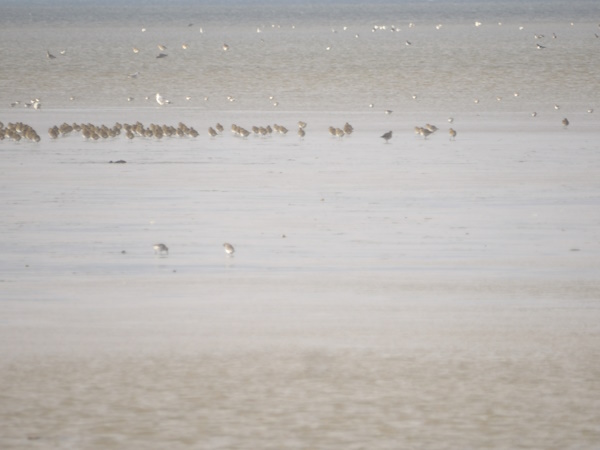 Til venstre for to lille kobbersnepper i midten af billedet. Resten er også lille kobbersnepper. Lagt på 5. august 2017, taget 5. august 2017 på Firtalsstrand ved Odense Fjord.