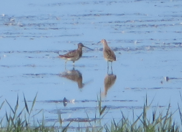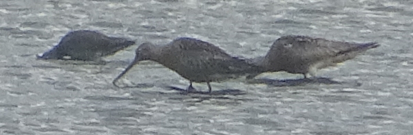 De tre fra før forstørret. 2 islandske ryler til venstre for en langnæbbet sneppeklire. Lagt på 12. august 2019, taget 12. august 2019 ved Mellemstykket mellem Firtalstrand og Ølundsgårds Inddæmning ved Odense Fjord.