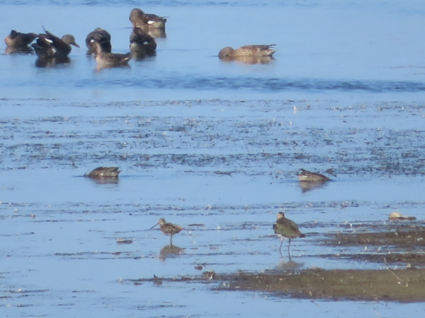 Nederst til venstre for en vibe. Ovenover er der krikænder og øverst er der knarænder. Lagt på 31. august 2021, taget 31. august 2021 ved Firtalstranden ved Odense Fjord.