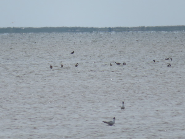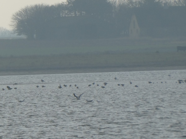 Den mørke fugl helt øverst i billedet. Ellers almindelige ryler, hjejler, strandskader, lille kobbersneppe, hættemåger og sølvmåger. Lagt på 13. november 2025, taget 13. november 2025 på Agernæs Flak på Flyvesandet på Fyns kattegatkyst.