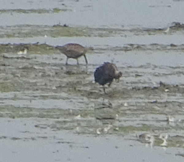 Vibe forrest. 2 islandske ryler til venstre for en langnæbbet sneppeklire. Lagt på 12. august 2019, taget 12. august 2019 ved Mellemstykket mellem Firtalstrand og Ølundsgårds Inddæmning ved Odense Fjord.