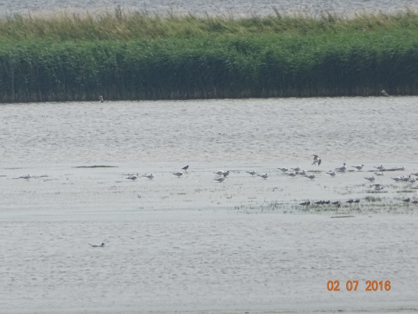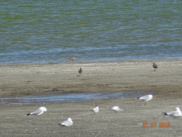 Øverst lille regnspove og to viber. Under dem stormmåger og hættemåger. Lagt på 28. juli 2018, taget 27. juli 2018 på Bøjden Nor på Sydfyn.