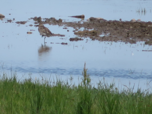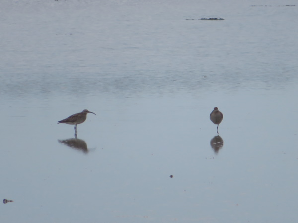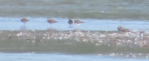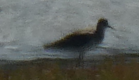 De 2 lille regnspover fra før forstørret. Over, under og til højre for dem store regnspover. Lagt på 3. april 2022, taget 3. april 2022 ved Ølundsgårds Inddæmning ved Odense Fjord.