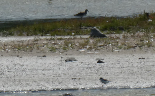 Øverst lille regnspove og nederst ung ørkenpræstekrave. Lagt på 4. august 2020, taget 4. august 2020 på Gyldensteen Strand 4 kilometer øst for Bogense på Nordfyn.