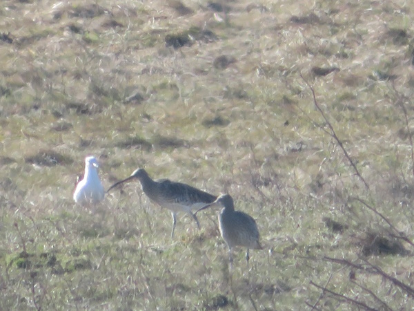 Til højre for stor regnspove, der igen er til højre for en høttemåge. Lagt på 4. marts 2023 taget 4. marts 2023 ved Ølundsgaards Inddæmning ved Odense Fjord.