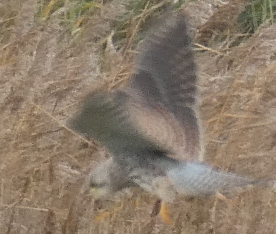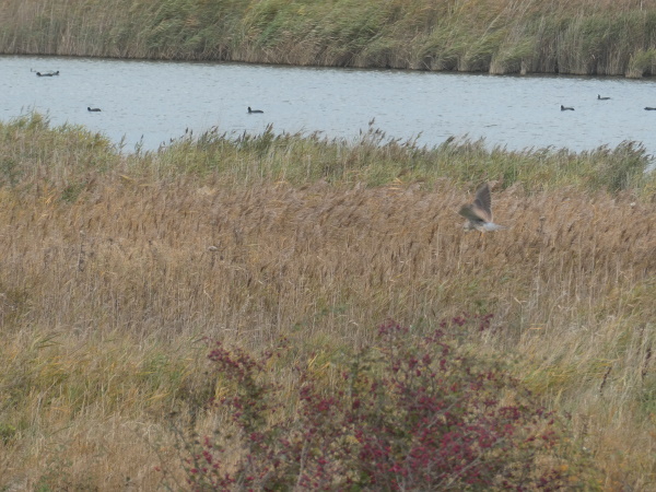Flyvende over græsset. I baggrunden svømmende blishøns. Lagt på 22. oktober 2020, taget 22. oktober 2020 ved Fjordmarken ved Egensedybet tæt på Enebærodde i udløbet af Odense Fjord i Kattegat.