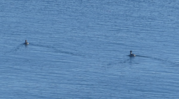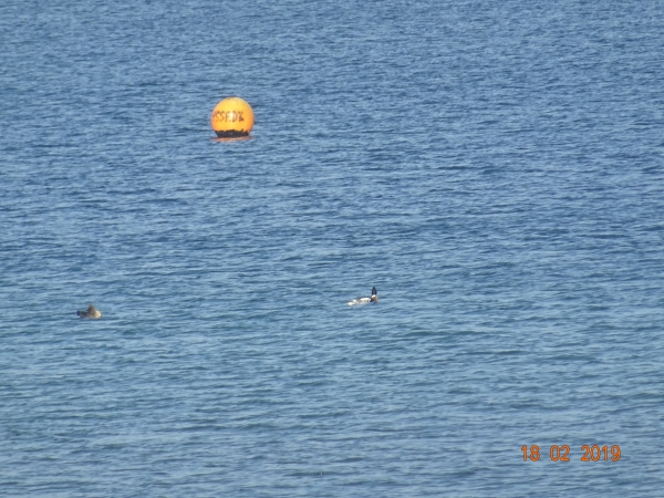 Den fra før til venstre for en en hanlig toppet skallesluger. Lagt på 18. februar 2019, taget 18. februar 2019 på Enebærodde i udmundingen af Odense Fjord i Kattegat.