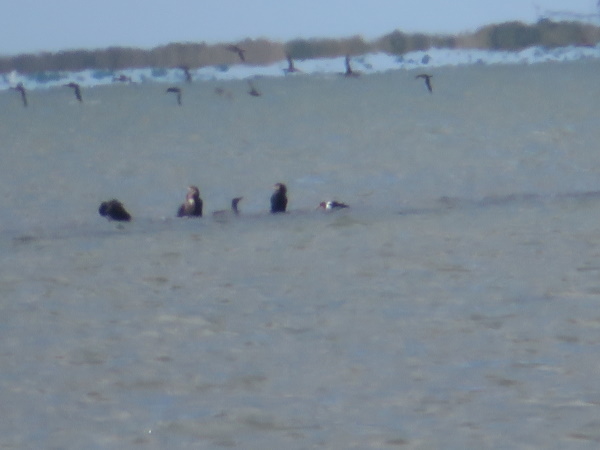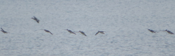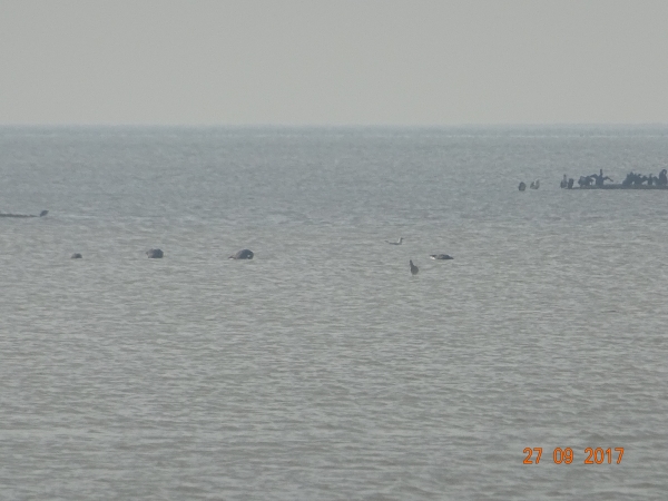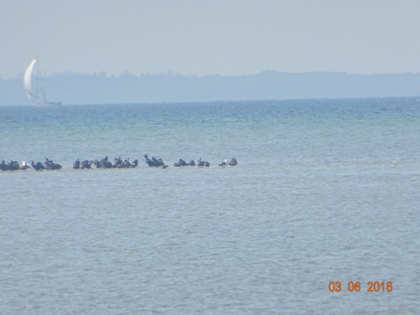 Fra venstre 7 skarver og en sølvmåge. Derefter 5 lomvier samlet. Derefter 2 sølvmåger og to tejster sammen med en flok skarver. De sidste tre er en sildemåge og to hunlige sortænder. Lagt på 5. juni 2016, taget 3. juni 2016 på Flyvesandet ud til Kattegat.