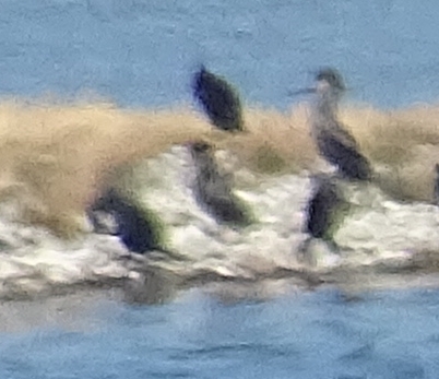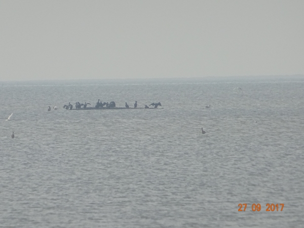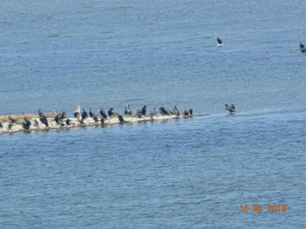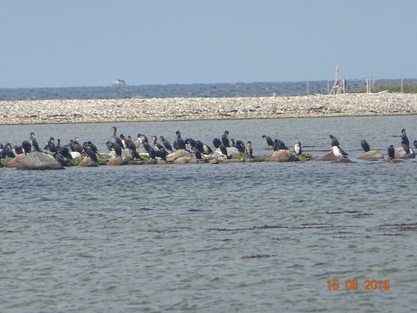 På billedet ses en masse skarver. Ud over disse ses også 1) to lomvier som fugl 4 og 5 fra venstre 2) sort ibis som fugl nr. 9 3) en lomvie og en fiskehejre næsten midt i billedet 4) midt i billedet en krage og en fiskeørn 5) en alk og en svartbag ude til højre. Lagt på 16. august 2016, taget 15. august 2016 på Fyns Hoved.