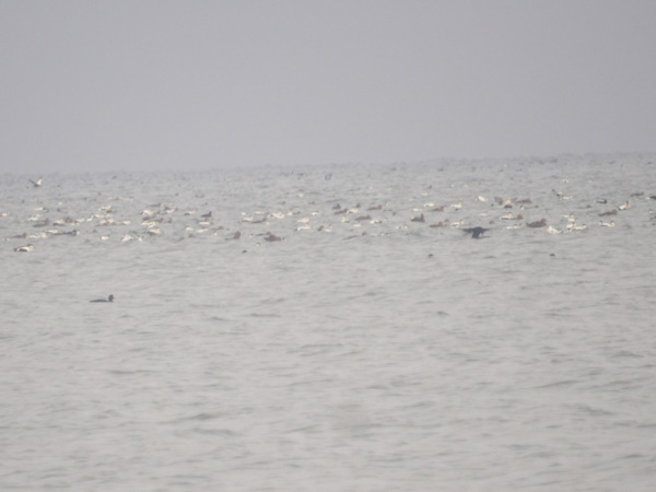 Midt i billedet ved en ederfugl hun. Ellers flere ederfugle, fløjlsænder og sortænder. Lagt på 11. november 2025, taget 11. november 2025 på Horseklint Strand på Fynshoved.