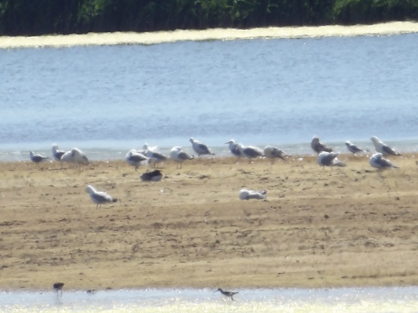 Den fra før og nogle af sølvmågerne forstørret. Lagt på 10. juli 2025, taget 10. juli 2025 på Ølundsgårds Inddæmning ved Odense Fjord.